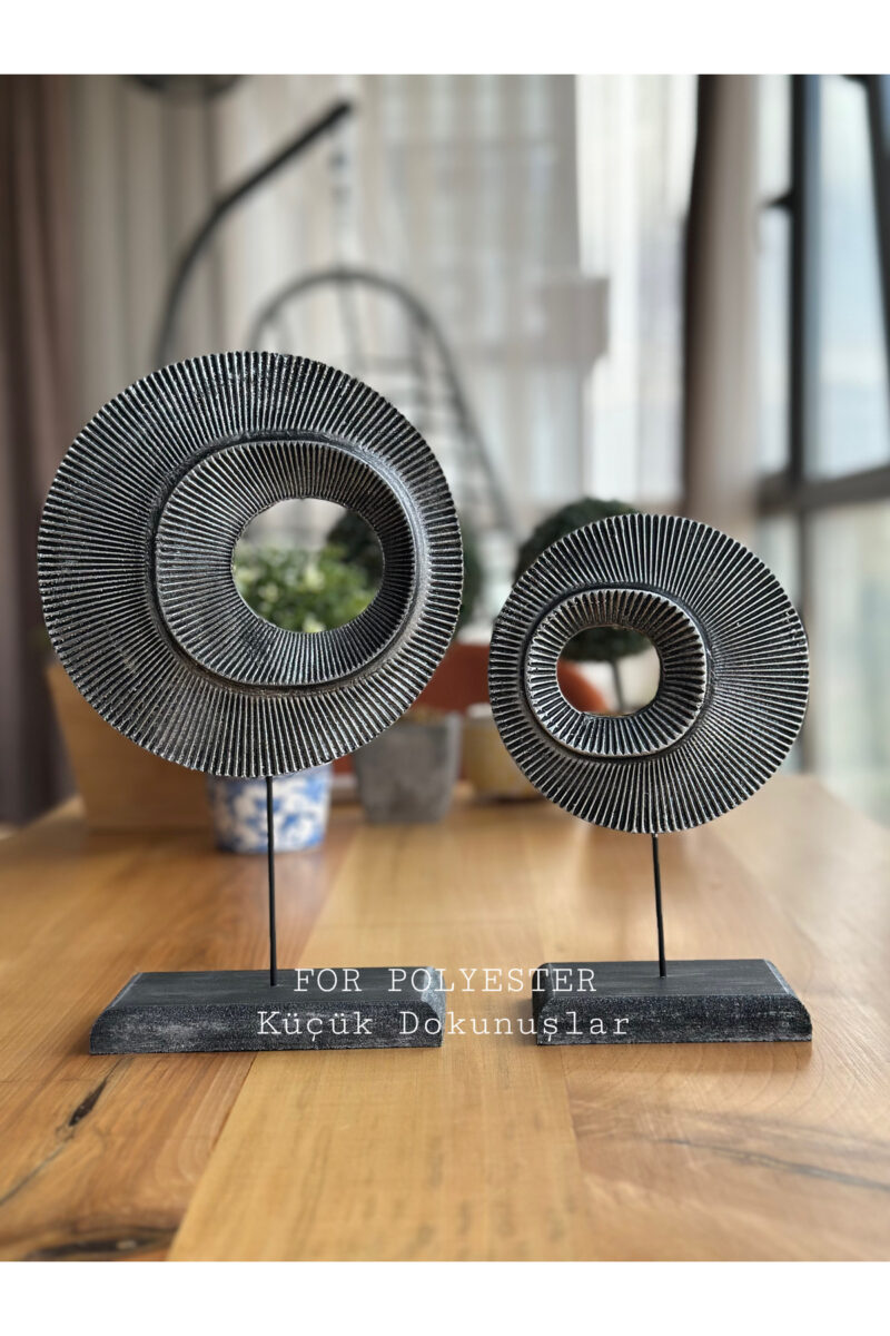 Modern tasarımlarıyla ev ve ofis dekorasyonunuza şıklık katan ikili takım.; Yuvarlak kısım polisin kaidesi ise ahşaptır bu sayede daha uzun Ömürlü kullanım sunar.; Büyük ürün ölçüsü : 30×18,5 cm, Küçük ürün ölçüsü: 22,5x14cm